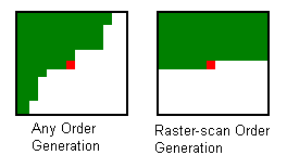 We tried both generic and raster-scan order generation schemes. First, we tried generating our pixels the same way Efros does: finding the pixel with the most known neighbors and generating from there. While conceptually this should generate the best results, it leads to a significant slow down. First of all, the program must find the pixel with the most known neighbors. (This step can go fairly quickly as long as you keep the pixels in sorted order.) However, because the pixels can be generated in any order, the surrounding region can look like anything. The left image in figure one shows the potential window around a pixel being generated with this method. The green area represents known pixels and the red dot is the pixel being generated. When comparing this region against regions in the original texture, we have to "mask" the known pixels so that the garbage values in the unknown pixels will not distort our measure of the match. Furthermore, because we never know exactly which pixels will be known in a given window, we have to store the full window for every point in the texture in the VQ tree. Then, when we are looking for a match from result image, we have to mask every comparison at every step along the tree to generate a result. This worked, but not quickly.