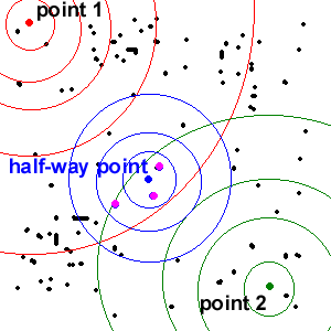 Third, we thought that we could get by far the biggest speed up by changing the way we found overlap points. As shown in the diagram below, we currently search the vector space out from each of the two original points looking for the overlapping regions. (The areas where the green and red circles cross). If we could instead average our original points to find the point half-way in between, and than do a search out from that point, the whole process would take seconds instead of hours. However, there are a couple of hurdles before implementing this. First, we would have to define what the half-way in between point was. This would probably be computed by first finding the closest points (in our space) to each of the two endpoints and than taking some sort of weighted average. Even after we determine this point, the results we get will be slightly different from taking points closest to the two endpoints. As shown below, the shape of the blue circles is different from the shape of the overlap between the red and green circles.